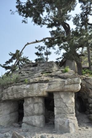 源義経が奥州へ落ちのびる途中、にわか雨の晴れるのを待ったという「義経岩」。