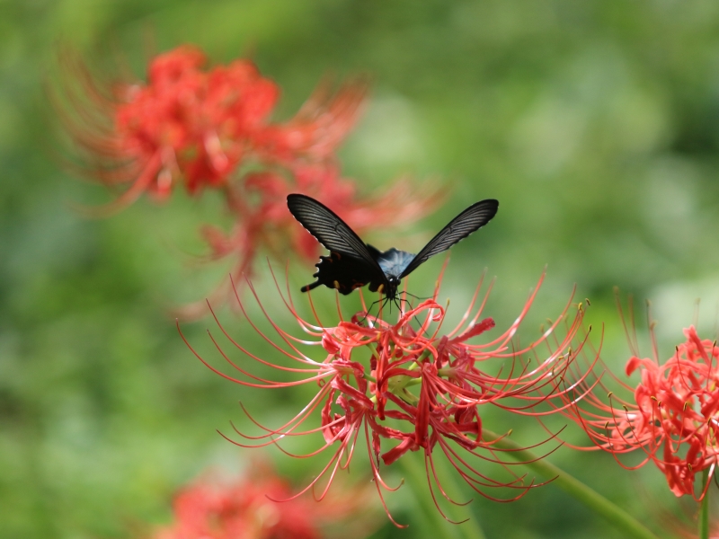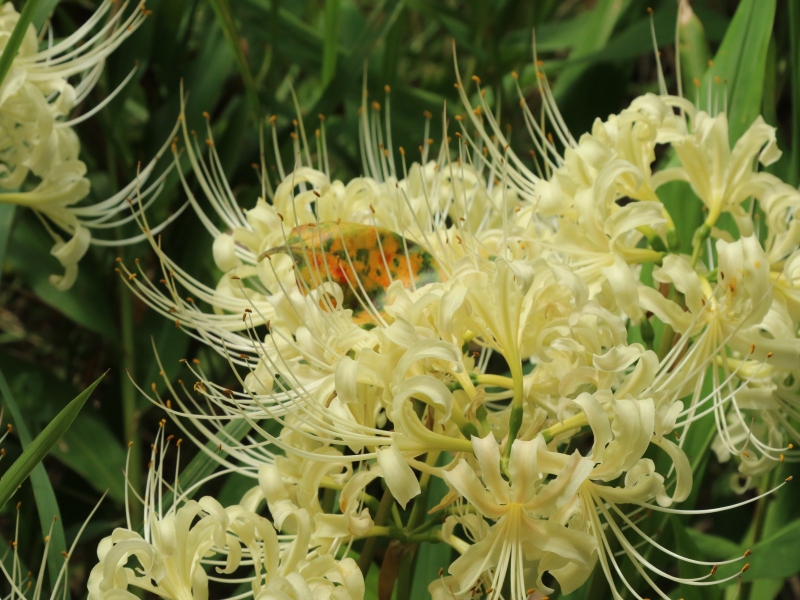 昨日の続き。農家の庭先の柿の木の下の彼岸花とクロアゲハ。日陰なので開花が遅い。 |