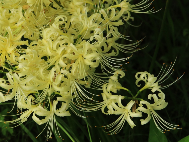 少し盛りを過ぎた我が家の黄色彼岸花。アゲハ蝶も来たようだが一緒に撮るのは難しい。 |