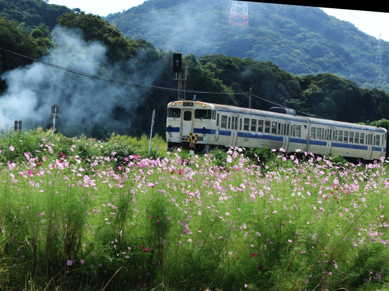 この前見つけた秋桜と日田彦山線の列車を撮ってきた。今日の列車は古いがそれに似合う畑で燃やす煙が加わった。 |
