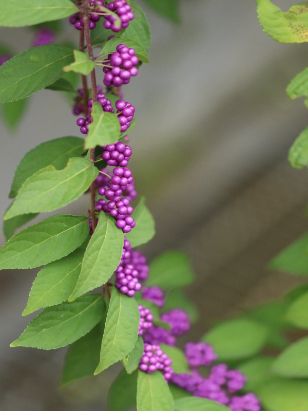 | 道路にはみでて実をつけたコムラサキ(小紫)。紫式部に似ているが垂れ下がった枝に実をたくさんつける。 |