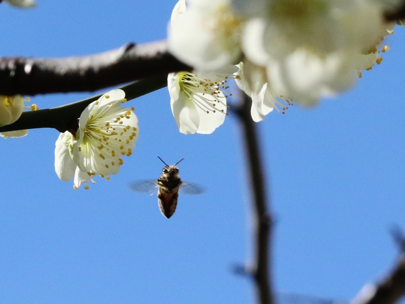 ほぼ満開。蜜蜂もやってきた。高速で連写すると違った写真になる。