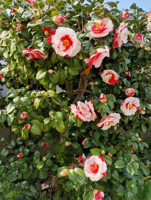 | 沈丁花が満開になり一帯に良い香りを漂わせている。岩根絞は二輪目が開花直前である。一輪目はてっぺんに咲いており撮れない。 |