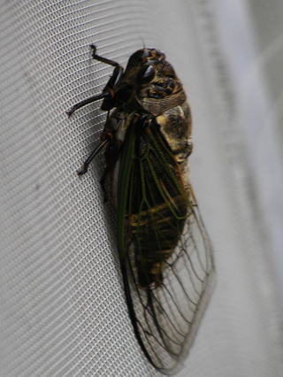皿倉山の頂の向こうに夕日が沈んだ直後。太陽はまだ光が強すぎて一緒に撮れない。今朝は夏の名残りのクマゼミ。網戸で翅を乾かしていた。 |