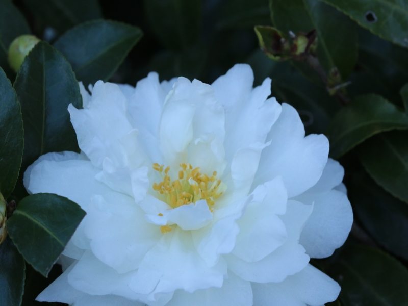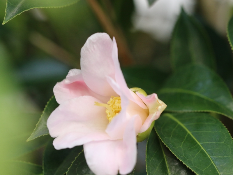 | 今日は咲き始めた侘助。名前からして華やかさは山茶花にかなわない。 |