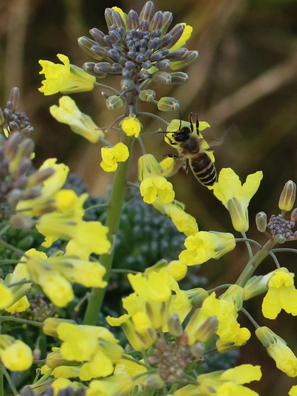 | 最後の6本目のブロッコリーの収穫をしてきた。後は小振りの脇芽になる。葉が立派に育っているので当分は採れそうだ。帰路の農家の畑ではもう脇芽が開花し地味な和バチが蜜の収集に飛び回っていた。 |