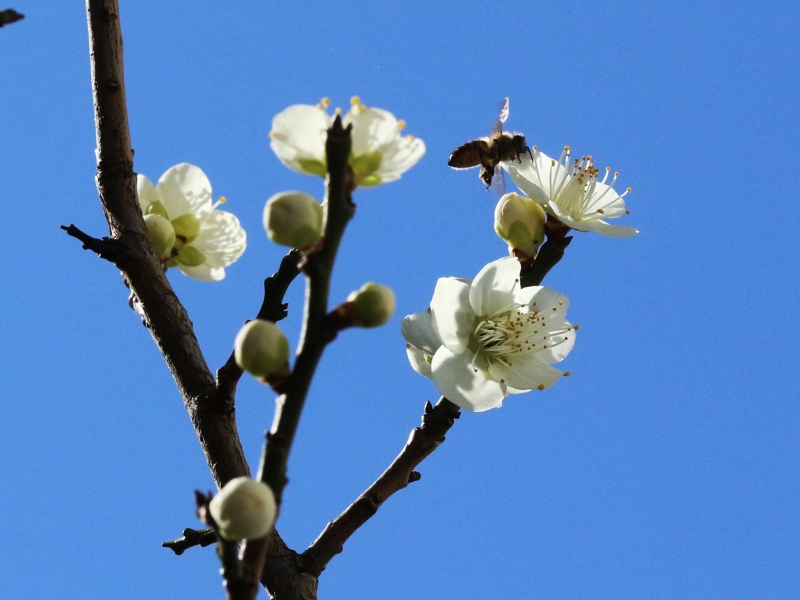 ほぼ満開。蜜蜂もやってきた。高速で連写すると違った写真になる。